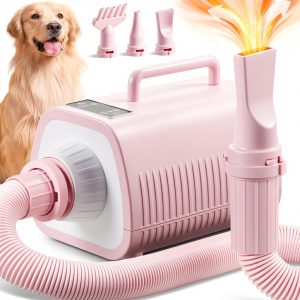 High Velocity Dog Hair Dryer – Dogs Blower Grooming Dryer with 9 Level Adjustable Speed & Temp, Soft Noise Pet Dryer for Grooming, Heat Resistant Hose with 3 Nozzles (Pink)