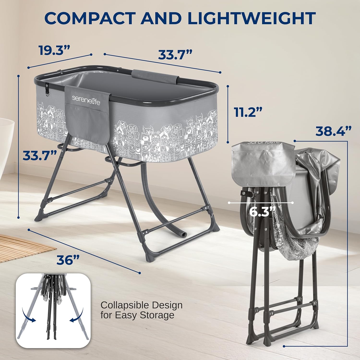 SereneLife Portable Dog Bath Tub with Drain, Foldable Indoor Outdoor Dog Tubs for Bathing and Grooming with Pockets & Leash Restraint, Collapsible Design, Supports Pets Up to 130 lbs